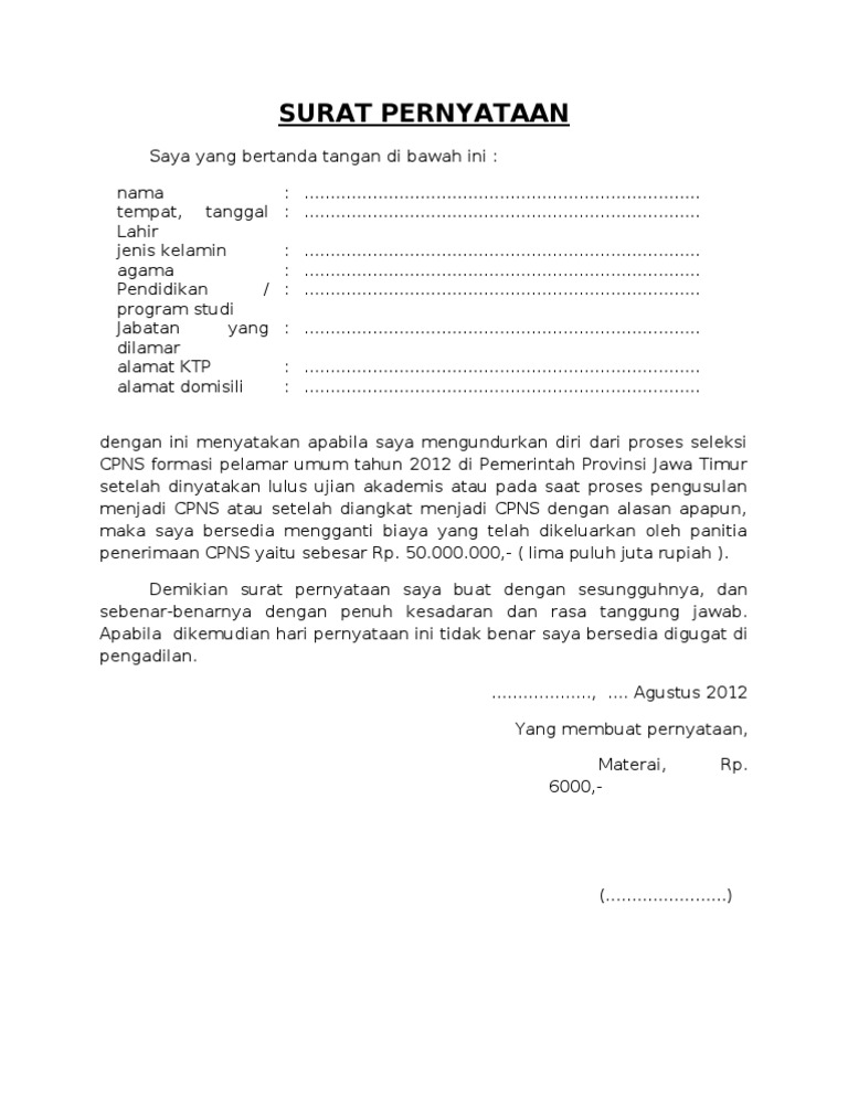 Makanya dalam dunia perdokumenan dan surat menyurat. Surat pernyataan calon taruna / taruni. Menulis surat izin untuk mengundurkan diri terkadang menjadi sulit karena perasaan tidak enak terhadap perusahaan. Surat lamaran dan surat pernyataan ini merupakan salah satu syarat yang harus di sertakan oleh peserta seleksi cpns kemenhub tahun 2021. Demikian pernyataan ini saya buat dengan.
